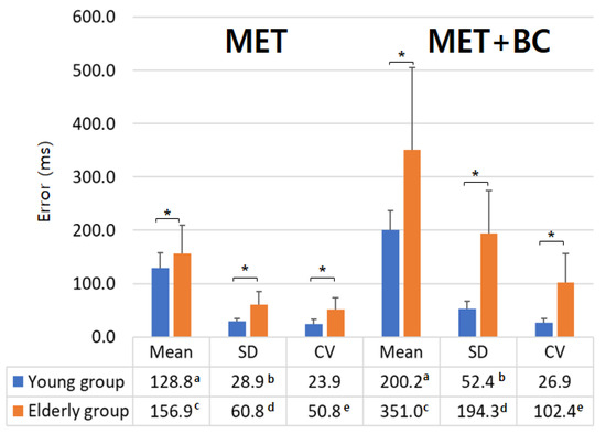 Mean, standard deviation (SD), and coefficient of variance (CV) of temporal errors between the metronome beat and the heel contact for each gait condition by age (*: Statistical difference between age groups by variable, a, b, c, d, e: Statistical difference by gait condition in each group; MET: walking with the metronome, MET + BC: walking with the metronome while counting backwards).
