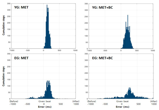 Cumulative distribution of the temporal errors between the metronome beat and the heel contact for each gait condition by age for all participants (15 time data bundles per bar; YG: young adults group, EG: the elderly group).