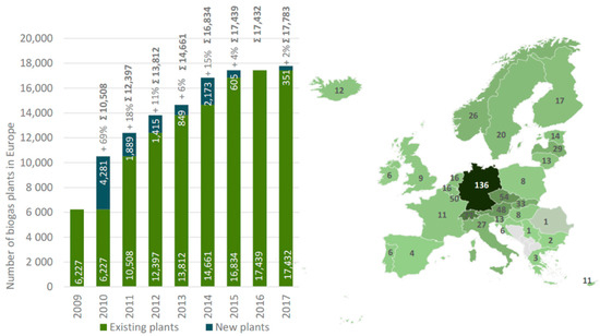 Converting all feedstocks to biogas with a ratio of 0.1 kg of feedstock per cubic meter of biogas would produce 68 Gm3 of biogas or more than 58 Mtoe (total oil equivalent) [25]. Data from EurObserv’ER 2017 suggest that in 2016, twenty-eight European Union (EU-28) countries used only a part of their feedstock to produced just under 16.1 Mtoe of biogas [27]. However, every year, the number of biogas plants increases. The European Banking Authority (EBA) Annual Report 2019 states that by the end of 2018, 18,202 biogas plants were operating in Europe after a decade of sustained growth, which was largely stable during periods of political turmoil in different countries [28]. Statistic data demonstrating the increasing number of biogas plants in the European Union and distribution by countries are shown in Figure 1.