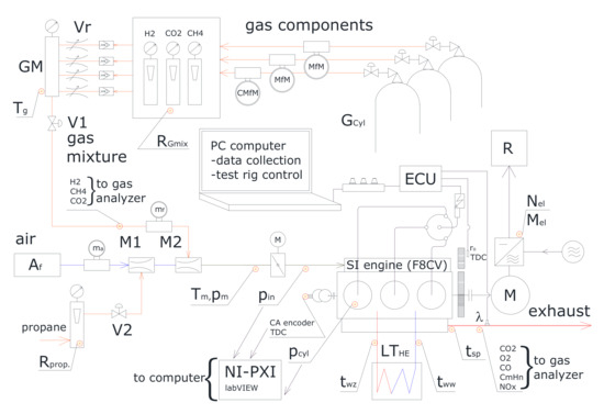 ST values for the mixture were chosen according to the optimal peak in-cylinder pressure position. The composition of the mixture was controlled using the lambda sensor signal and by adjusting the flow of the gas mixture to the engine inlet. During the tests, the replacement of the biogas mixture was stored in high-pressure bottles. The gas fuel was supplied to the engine through the gas mixer.