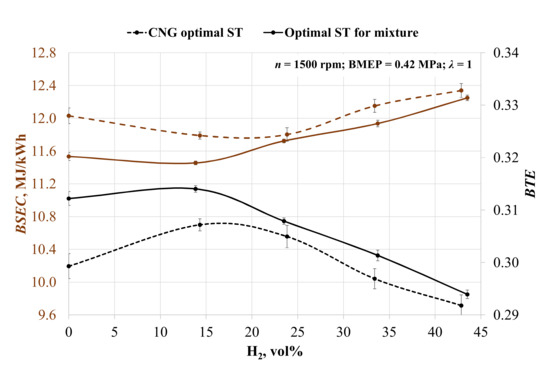 Change in the brake-specific energy consumption (BSEC) and brake thermal efficiency (BTE) depending on the volumetric fraction of hydrogen and spark timing.