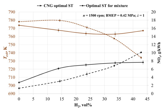 Change in exhaust gas temperature (Texh) and specific emission of nitrogen oxides (NOx) depending on the volumetric fraction of hydrogen and spark timing.