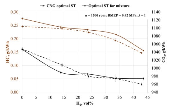 It is clear from the exhaust emission data that increasing the hydrogen concentration in the fuel mixture alters the hydrogen–carbon molecule ratio in the fuel mixture. Figure 5 shows the reduction in unburn fuel emissions when adding hydrogen. In the case of CNG ST, emissions of unburned hydrocarbon (HC) decreased by 3.60, 8.99, 21.08, and 40.36% when adding 14, 24, 33, and 43 vol% hydrogen. When adjusting ST, the HC reduction was 11.52, 15.16, 21.84, and 43.53% respectively. HC reduction was affected by the decreased amount of carbon molecules in the fuel mixture and the increased combustion and mixing of fuel and air [63]. ST influenced the increase in HC emissions when the engine ignition timing was advanced. Without hydrogen and the advanced ST by 8 CAD BTDC, the HC emissions increased by 12%. The increase in HC emissions is noticeable in all measured point. The advanced ST reduces the exhaust temperatures, which consequently, reduces the speed of the oxidation reaction of the unburned hydrocarbons.