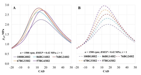 Pressure in the cylinder (pcyl) depending on hydrogen concentration. (A)—with optimal ST for the mixture; (B)—with optimal CNG ST.