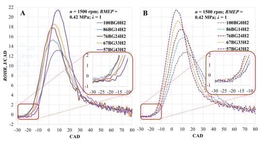 Rate of heat release (ROHR) in the cylinder depending on hydrogen concentration. (A)—with optimal ST for the mixture; (B)—with optimal CNG ST.