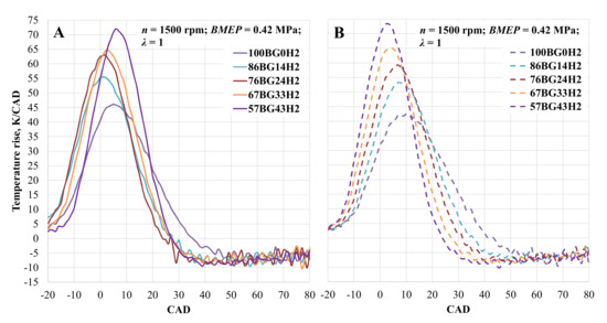 Temperature rise in the cylinder depending on hydrogen concentration. (A)—with optimal ST for the mixture; (B)—with optimal CNG ST.