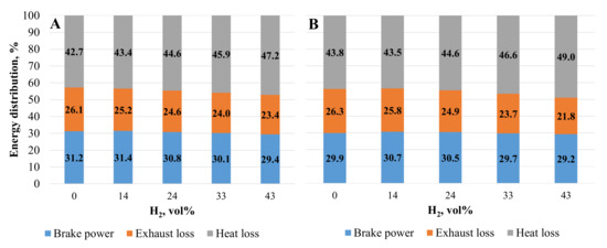 From the energy distribution shown in Figure 9, it can be seen how the energy losses through the exhaust increase in both cases of the ST setting as a result of the increasing proportion of hydrogen in the mixture. With the addition of 14 vol% hydrogen and the ST set from 28 to 36 CAD BTDC, the exhaust energy losses decreased by 2.4% and the propulsion energy increased by 2.3% due to better fuel mixture combustion, reduced ignition delay time, and increased BTE. The addition of hydrogen increased energy heat losses due to the increased combustion temperature and the greater increase in ROHR.