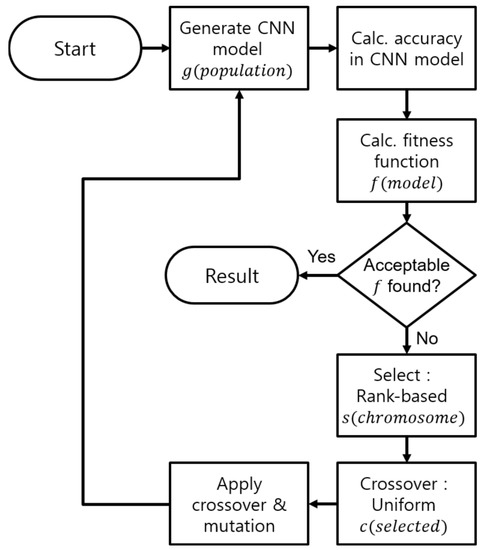 As the performance of the CNN model is greatly affected by both network architecture and hyperparameters, the search space suggested by Genetic-CNN is insufficient. Therefore, in this paper, in order to find the effective network architecture for a given input, we select both network configurations and hyperparameters as the search space, and use GA to search for the ideal structure. Figure 3 illustrates the procedure of our system.