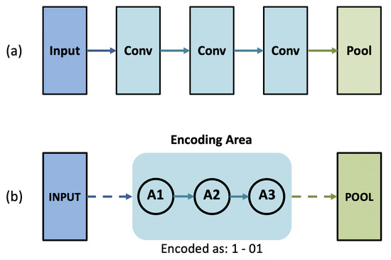 Definition of the encoding procedure is very important for our process, as it is used from the start of the algorithm—initialization. This step generates a population of CNN models in encoded, binary form. This step generally uses information from a previous generation to generate models, but for the first generation, it initialises the process by randomly creating a number of candidates. Each of the population is called as a chromosome, s. During this process, each bit of a chromosome is sampled independently using a Bernoulli distribution.