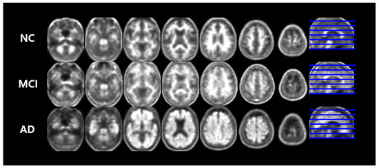 Multi-slices of pre-processed 18F-Florbetaben imaging by disease group. Each column shows 7 axial planes observed at equal intervals, and a sagittal plane. The blue lines represent the extracted level of each axial plane.