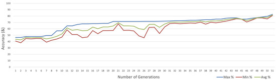 Figure 6 visualises the accuracy values for each generation in graph form. Convergence of three accuracy values is observed, showing that all individuals in the algorithm found the ideal neural architecture as the number of generations increases.