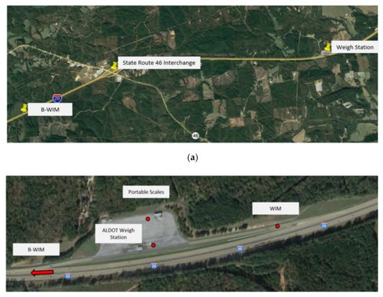 To verify the accuracy of vehicle weight measurements, the same vehicles needed to be measured by all tested weighing systems. Therefore, it was necessary to find a location that has in close proximity a truck weigh station and additional space to evaluate the weight by portable scales and the WIM system. The selected weigh station in Alabama is located close to the WIM system and allows collecting data for three measuring techniques. Next, the bridge had to be selected to install the B-WIM system. Figure 1 presents (a) an overview of weigh station and B-WIM locations, and more closely, (b) the weigh station, designated space for portable scales measurements, and the Alabama Department of Transportation (ALDOT) WIM system.