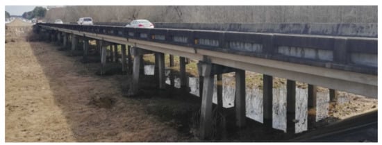 The B-WIM measurement technique relies on using the space under a bridge to install measuring devices to not interfere with the flow of traffic measurements. It requires the installation of necessary instruments. The bridge’s selection was based on its proximity to the Cleburne truck weigh station and a WIM station. The bridge located at kilometer 327.242 of interstate highway I-20 in Cleburne County, Alabama, was selected. The exact location of the bridge is 33°38′12.5′′ N 85°31′46.8′′ W. The bridge was built in 1970, and it consists of 11 spans, eight of them are reinforced concrete, and the remaining three are steel girders. The total width of the bridge is 13.28 m, and its total length is 132.6 m. Figure 2 presents the side view of the instrumented bridge.