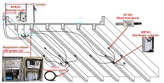 The ST-503 sensors located under the girders measured the weight of individual vehicle axles, while the sensors situated directly beneath the deck measured the number of axles and vehicle speed. A simplified measurement scheme is shown in Figure 5. The strain transducers were bolted into steel anchors on the bottom surface of selected elements. Six sensors were attached to all beams and four directly to the bottom side of all beams (6 sensors).