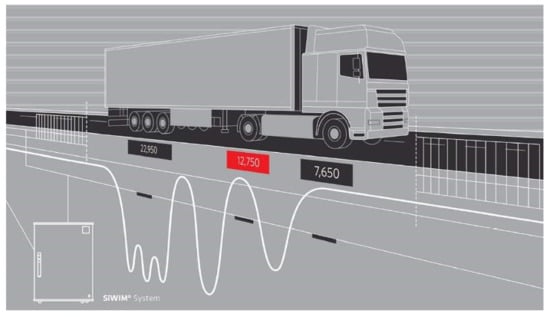 The weigh-in-motion technologies are available for permanent or temporary traffic data collection classified in the US by ASTM E1318-09 [] as WIM from Type I to Type IV, depending on the performance requirements of the WIM system. These systems were designed for long-term traffic monitoring. According to ASTM, the calibrations of weighing systems are performed using test trucks. The WIM systems can be classified as low speed (LS-WIM) or high speed (HS-WIM). LS-WIM systems are more accurate than the HS-WIM, but they require measurements with the vehicle speed only up to 15 km/h, which is not feasible on highways. The LS-WIM systems are equipped with strip and bar sensors, scales, and plates, embedded in a pavement structure.