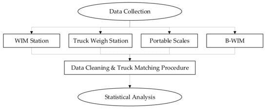 The static measurements were conducted by the State Troopers, and the data was given in a printed version, including vehicle parameters, time stamps, and plate number. The collected traffic data by static scales were as follows: 6 March—42 trucks, 16 March—48 trucks, and 18 March—50 trucks. The weigh station measured the steering axle and two tandems, but the portable scales weighted every axle separately. The weigh-in-motion data was then analyzed to find the measured vehicles by the number of axles, the time stamp, plate number, and US DOT number. All the statically measured vehicles were captured in the WIM database. Afterward, the B-WIM system was analyzed to find the measured vehicles. To capture the vehicles, the vehicle class, a number of axles, timestamp estimation, the distance, and the speed limit were considered to match those vehicles. The B-WIM was located further from other truck weigh station, with exit 205 to route 46 located between them. Thus, some of the vehicles were able to exit I-20. Therefore, a few of them were not found in the B-WIM system—they did not pass the weighting system in the predicted time window or, the truck was not recognized while passing with another similar vehicle. Figure 6 presents the traffic data collection flowchart. The data analysis captured 34 trucks on 6 March, 46 trucks on 16 March, and 49 trucks on 18 March. An overall number of considered vehicles measured by portable scales is 140, truck weigh station—139, WIM—136, and 127 by B-WIM system. The matching vehicles were taken into consideration in the accuracy analysis.