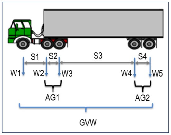 All four measuring techniques captured different vehicle parameters. The following vehicle attributes were considered during the analysis: GVW, axle weight, and tandem axle weight. Figure 7 shows the symbols of attributes used in this study. The attributes available for considered weighing systems are summarized in Table 1.