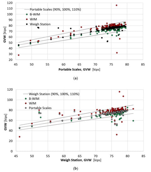 GVW measurement tolerances (a) compared to portable scales measurement, (b) compared to weigh station measurements.