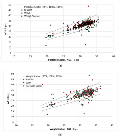 The first tandem axle weight measurement (a) compared to portable scales measurement, (b) compared to weigh station measurements.