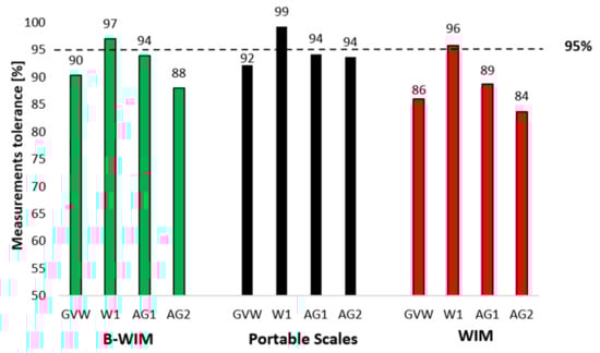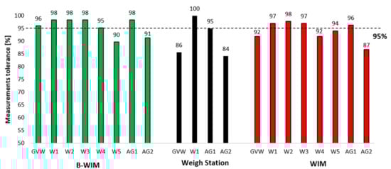 Truck weigh stations also provide accurate results, but their operation is expensive and, therefore, inefficient. Moreover, their location is well known, and haulers of illegally overloaded vehicles can find alternative routes and avoid being ticketed. The weigh station measurement was used as a reference point for weigh-in-motion measurements. Additionally, truck weigh station measurements were compared with portable scales, where tolerances between the analyzed vehicle attributes vary from 84–100%. It provided good results, but some of the measurements are below the required 95% compliance level.
