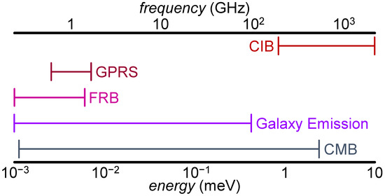 Frequency and energy ranges relevant for different GHz astronomical sources, such as cosmic infrared background (CIB), gigahertz-peaked radio sources (GPRS), fast radio bursts (FRB), emission from galaxies and cosmic microwave background (CMB).