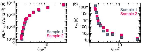 Additionally for the JES, the noise equivalent power is limited by thermal fluctuations between the electron and phonon systems in A [44]. Other limitations to the resolution can arise from the measurement of the superconducting to normal-state transition, which we assume it is optimized to be sub-dominant. The values of can be extracted by substituting in Equation (16) the measured parameters of the JES, such as , characteristics, and (see previous sections for details). We note that the performance can be extracted at any value of I, since the operation in the dissipationless superconducting state ensures that (see Figure 5b,c).