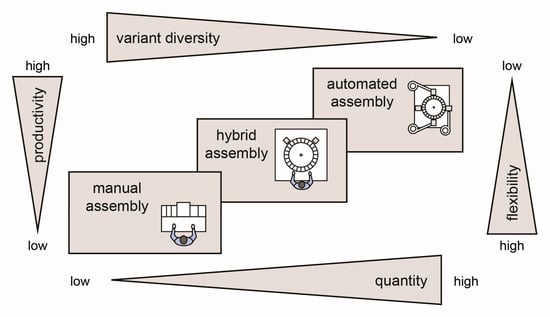 An efficient and reliable assembly process is a critical aspect of manufacturing, ensuring that the final product meets the required quality level. Engineers usually consider several variables when selecting an appropriate assembly system. Among them are flexibility, productivity, product variants and production volume [1]. Figure 1 shows the relationship between some of these variables and the level of automation in the assembly system. The development of industrial robotics has induced a significant increase in the automation and productivity of manufacturing processes, including assembly [2]. However, in manufacturing domains where product complexity and variety present particular challenges, manual work remains a viable alternative. This is the case of such manufacturing domains as consumer electronics [3], aerospace manufacturing [4,5], combustion engine assembly [6], automotive manufacturing [7,8] and the production of industrial machines and tools [9,10]. Hence, for manual assembly to yield a final product of the appropriate level of quality, several operations must be executed properly. For example: selecting, handling and fitting parts; checking; applying force; and retrieving and analyzing information. Unfortunately, these operations are susceptible to human error and represent potential sources of defects. Swain and Guttmann [11] define human errors as “any member of a set of human actions that exceed some limit of acceptability, i.e., an out-of-tolerance action, where the limits of tolerable performance are defined by the system”. Common error-related defects in manual assembly processes include loose connections, missing components, the installation of wrong components, improper application of force to fasteners, damage during assembly and contamination by foreign object debris [12,13]. Poor physical and cognitive ergonomics have been found to increase errors and impact product quality [12,14]. The links between human factors, errors and quality issues have been recognized in the literature [15]. Human errors are to be avoided to limit economic losses associated with defects and unnecessary waste. For this reason, ergonomics and human factors discipline is considered to be a key practice area within the lean manufacturing approach [12].