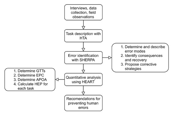 Human error analysis process used in the study. HTA = hierarchical task analysis; SHERPA = systematic human error reduction and prediction approach; HEART = human error assessment and reduction technique; GTT = generic task type, EPC = error producing condition; APOA = assessed proportion of effect; HEP = human error probability.