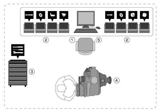 The case consists of a mechanical assembly worker installing various components to the main structure of the object being assembled. Instructions are delivered by the manufacturing execution system (MES) and displayed on a computer terminal at the workbench (PC stationary screen), which is located approximately 2 m from the assembly position. Instructions consist of text and 2D drawings providing basic visual descriptions of assembly steps. Parts are stored in bins at the workbench. The worker moves around the assembly position at the center of the workstation as needed. Figure 3 shows the schematic representation of the assembly workstation’s layout and the general workflow. The assembly line consists of six workstations with similar characteristics to the workstation shown in Figure 3. The main assembly structure is transferred from one workstation to the next using a dolly. The height and direction of the main structure of assembly can be modified by the worker to gain access more easily.
