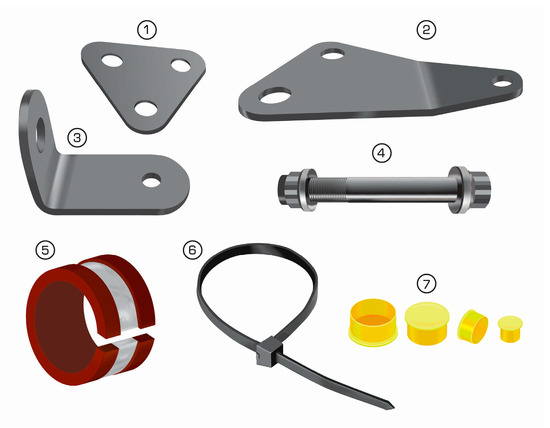 Parts used in the assembly tasks: (1) bracket A, (2) bracket B, (3) bracket C, (4) nut and bolt, (5) cushioned loop clamp, (6) tie-wrap and (7) cap covers.