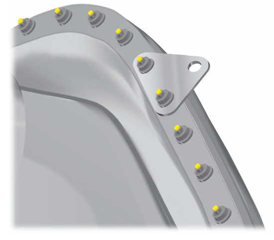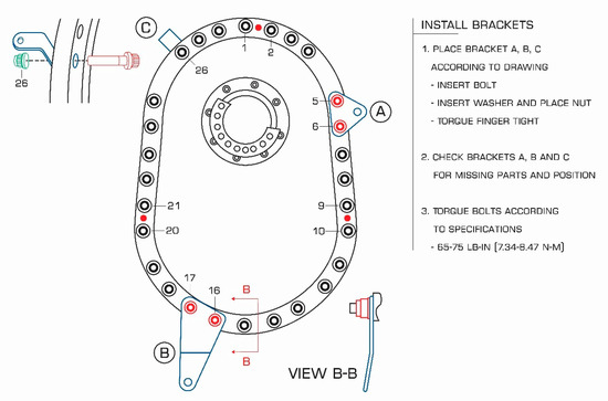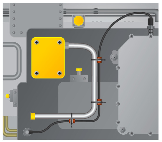 An example of a 2D drawing provided to the assembler in the work instruction of task No. 1 (install three brackets) is shown in Figure 5. Work instructions are displayed on a 19-inch stationary PC monitor. The computer’s input devices are a mouse and a keyboard, both connected by cables to the PC. Figure 6 shows bracket A installed and secured with two bolts to the assembly structure. Similarly, Figure 7 shows the data cable and the cap covers installed on the assembled object. The data cable was secured to the structure using cushioned loop clamps and tie wraps. Cushioned loop clamps were used to avoid damage to the data cable in an operational context. Cap covers were installed to protect different inlets.