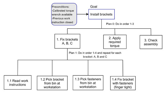 Once the tasks to be analyzed were chosen, each of them was broken down into the subtasks required to achieve the overall goal of the task. This was achieved using the hierarchical task analysis technique developed by Anett [79]. The description of the tasks was based on the study of work procedures, as described in the manufacturing execution system (MES). Additionally, a total of 40 h of field observations supported this and other steps within the human error analysis process. Five assemblers were observed during an entire workday (eight hours) at their respective workstations. However, these field observations focused primarily on the execution of tasks. The main goal was to understand the structure and sequencing of tasks and subtasks in a real context (work as done). No personal data about the assemblers was collected. The assembly line and workstations to be observed were identified based on results from the analysis of quality records.