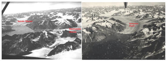 During the seventh Thule Expedition, a systematic survey of the southeast coast of Greenland was carried out from 1932 to 1933. Nowadays, at the Natural History Museum of Denmark, there is a long-term project called “AirBase”. It is a database which has a quarter of a million aerial photos recorded by Danish survey agencies in the period from 1930 to the 1980s. This is a unique source of information about glaciers [7,8].