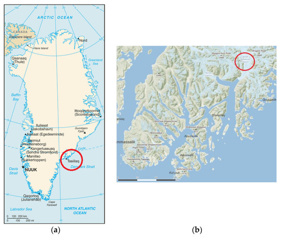 (a) Map of Greenland (http://www.getamap.net/maps/greenland_%5B_denmark_%5D/ostgronland/_knud_rasmussen_glacier/) and (b) the Knud Rasmussen Glacier (66.0817028N, 36.3402919W), (http://www.mapy.cz).