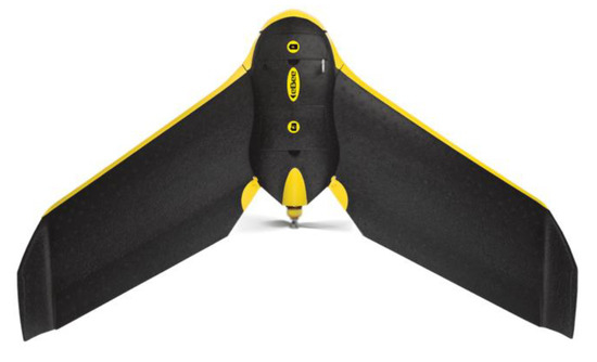 Remotely piloted aircraft system (RPAS) is a less used but correct acronym for a drone [13]. The eBee drone, senseFly, from Switzerland, was used in this case for different reasons. (1) It is light, made from Styrofoam, easy to use, takes off by hand, and lands without any special landing pad, (2) it is easy to transport (in a padded backpack), can be divided into several parts for transport, is electrically powered, and uses small batteries, (3) it has a relatively long time of flight up to 40 min and altitude access of hundreds of m, because it is a winged drone, and (4) it flies with full autonomy based on GNSS (Global Navigation Satellite System) and IMU (Inertial Measurement Unit) devices and the flight plan, and has changeable cameras (Figure 5 and Figure 6). However, the drone weighs less than one kilogram and the flight can be affected by gusts of wind, and furthermore, cameras used in this type is low-cost only. Unfortunately, the type used was not a GNSS RTK (Real Time Kinematic) system, which allows precise georeferencing of outputs without geodetically measured ground control points (GCP).