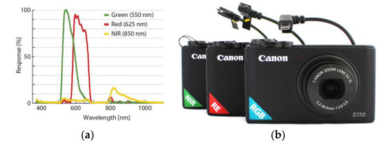(a) Spectral response of the Canon PowerShot ELPH 110 HS (NIR) and (b) the changeable cameras for the eBee drone: near-infrared (NIR), red-edge (RE), and red-green-blue (RGB). The camera has a 1/1.7″ back-illuminated CMOS (Complementary metal–oxide–semiconductor) sensor, image size 12.1 MPix, camera weight 153g excl. battery.