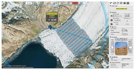 Before the flights, flight planning is necessary. The eMotion software is used with the eBee system running on a notebook. This software uses a common GNSS device for navigation. During the flight planning in this software, satellite images from ordinary free web sources (Google, Microsoft, Nokia, and others) are used as a map background. Unfortunately, in Greenland, actual satellite data from these sources was unavailable, and it was not possible to precisely define the exact parameters and destination of the drone flight. This proved to be a problem with flight planning [10,13,14]. The front of the glacier was hundreds of m away from the latest satellite images, so the flight plan had to be estimated on-site (Figure 7).