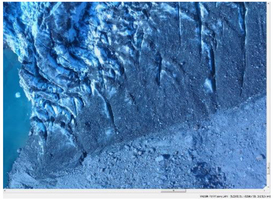 Finally, this transformation result was done with the RMS = 0.67 m. Many parameters affected the resulting accuracy. The main ones were the pixel size of 10 cm and the type and structure of the surface, including the possible actual deformation of the glacier over time (Equation (3)). Better results cannot be expected under the current conditions and chosen equipment. It should be noted that the model was created from images taken in a time span of approximately 35 min. Even in this short time, parts of the glacier moved, which affected the result.