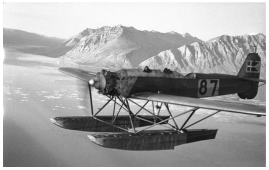 The Heinkel seaplane with open cockpit for three persons (pilot, radio-operator, and photographer in the back (photo: the Arctic Institute, https://arktiskinstitut.dk). The taking of the photos was carried out from a height of up to 4500 m at a temperature of −40 degrees Celsius frequently. Nowadays, these conditions are hardly imaginable.