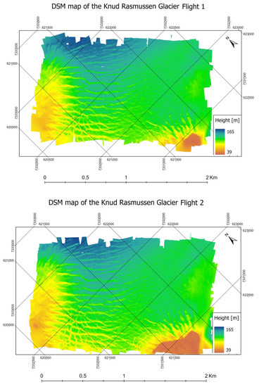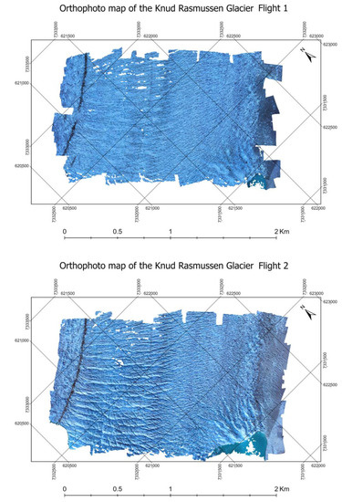 The fastest running ones have a speed in the middle of up to tens of m per day, such as the Eqi Glacier or the Jakobshavn Glacier in west Greenland. In the case of the Knud Rasmussen Glacier, the flow rate in the middle nearby the glacier face is considerable and can reach a value of around 12–15 m per day at most; however, this is only an extrapolation, but it correlates with the measurement on other glaciers. Here, problems were found: only a short time span was used, only one measurement in the summertime was carried out, the parameters of the flight were not ideal due to the local conditions and lack of time. Any precisely measured control points were used. The problems with the precision and time of flight can be nowadays solved with a modern eBee RTK with a base station and with better quality batteries, and with more time for these experiments.
