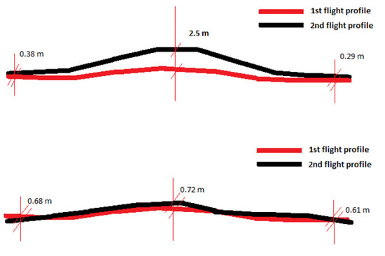 By the computing in Metashape software, 74,416 tie points were found in the first set of images for a sparse point cloud. In the second set of images, the number of tie points was 92,693. After the depth map was created, 221,341,562 points for a dense point cloud were created for the flight and 231,635,556 for the second flight. Both point clouds were exported without modifying their original coordinate systems. It means that the second point cloud was not transformed into the coordinate system of the first point cloud.