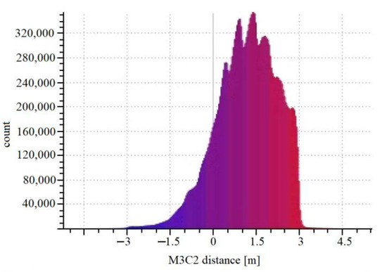 Histogram of the Model-to-Model Cloud Comparison (M3C2) distance. Negative values are errors from the computation occur on the borders only, caused by missing marginal data in both files. These data were filtered out.