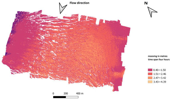 The results of the analysis show that the glacier moves fastest in the middle with the speed of 2–3 m in a time span of four hours. The histogram (Figure 13) shows that the mean speed of the glacier is one meter per four hours. From the results it can be concluded that with an error of 0.67 m the glacier Knud Rasmussen moves at an average speed of around six m per day. The fastest parts can have a speed of 12–15 m per day, while the border parts move practically by this method immeasurably in the short time span (Figure 14). This agrees with other studies [10,20,21,22].