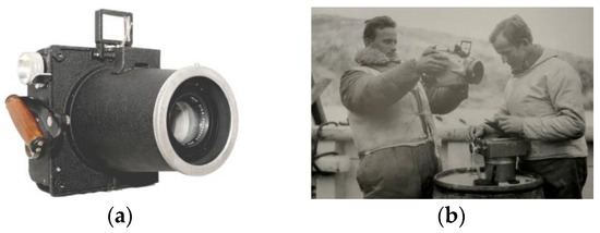 (a) The Fairchild F-8 camera, (b) a historical photo with the pilot and photographer in the book. The photographer holding a Fairchild F-8 camera [7].
