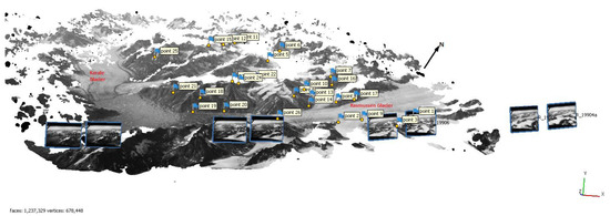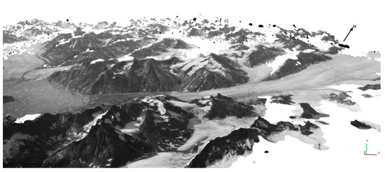 Only eight historical images were selected, from which a project was created to process image information into a 3D model. It was necessary to define at least the basic parameters instead of the elements of internal orientation. A focal length of 240 mm was used, and the pixel size (14.2 µm) was derived from the size of the scanned photographs in pixels and lines based on the original image size of 5″ × 5″. The additional part of the film was used for frame information, such as time and photo number. Metashape software was used. Automatic processing was not possible due to the low quality of scanned paper photocopies and the unknown internal and external parameters of the chosen photogrammetrical images. It was necessary to find suitable tie points manually; in the end, 25 tie points were used for a correct calculation. A sparse cloud was calculated, and the points were filtered using a “gradual selection” procedure, which filtered out points with error of bigger than ten pixels. This parameter was set empirically so that approximately 30% of all points were deleted from the processing. The camera parameters were recalculated until stable results were obtained. Some pictures did not have a regular photogrammetric overlap; they were taken by hand and it was almost always a pair of similar pictures. From the photo-flight sequence of the Knud Rasmussen Glacier, all images were finally successfully processed. An illustrative model of the historical status was calculated (Figure 16, Figure 17, Figure 18 and Figure 19).