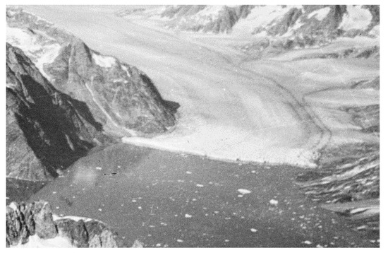 The Knud Rasmussen Glacier in a historical photo (detail); unfortunately, from this photo, it is not possible to get 3D information (only the glacier delimitation).