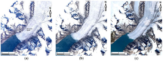Sentinel 2a data; (a) 31 July 2020, (b) 9 October 2020, lower part of the glacier is affected by hill shadows.
