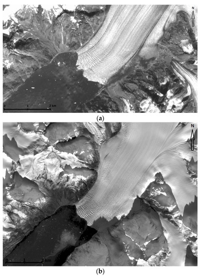 As a new type of free satellite data, the Copernicus system was used, especially the Sentinel 2a satellite (Figure 21). Unfortunately, in the archive, only data from last two year are on-line. Older data must be ordered. Most of the satellite scenes are cloudy and cannot be used for this work, the images taken during summertime can be used without processing problems, other can be affected by the shadows, which are in the Greenland due to short day time very long (Figure 21b). We processed scenes from summertime and wintertime between 2019 and 2020 for prolonging of our study and research of usability of different image data. For comparison with other image data, only the one multispectral channel (Red) with a pixel size of 10 m was used. These images were used for delimitation of the Knud Rasmussen Glacier front. As it is visible on (Figure 21a,b), the glacier lost a front part after summertime in 2020.
