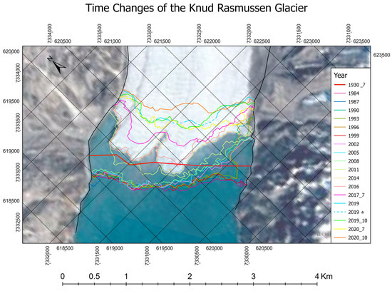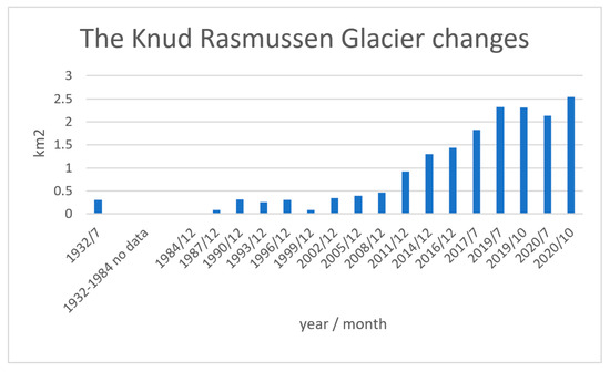 The Knud Rasmussen Glacier area changes between 1932 and 2020; the basic state was the year 1984 (i.e., the state “zero”). Between 1932 and 1984, we do not have data about the glacier status.