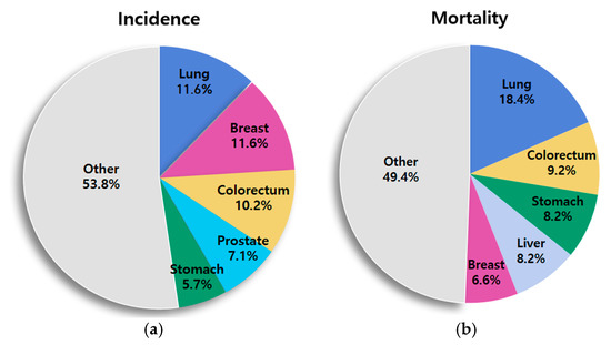 Distribution of cases and deaths for the five most common cancers in 2018: (a) incidence and (b) mortality.
